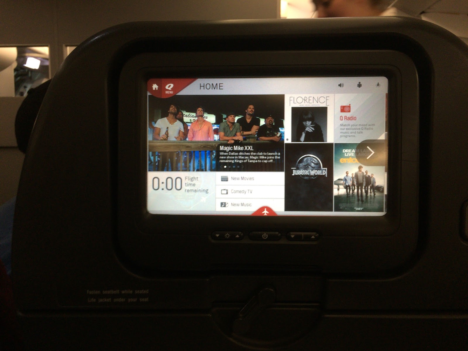 カンタス航空の個人画面。タブレット的な動きで、かなり先進的なインターフェイスかつ充実度。JALのもいいんだけど、これと比べると、古ぼけた感じがしてしまった。コンテンツ数は、それほど変らないと思う(最新の映画は、かなりJALのとかぶっていて、既に見たものばかり)から、見せ方と操作性の問題だと思う。