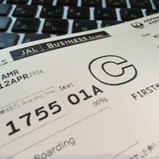 ラウンジにいたら、名前を呼ばれる。そしたら「ビジネスクラス」へのインボラ(インボランタリー・アップグレード)。エコノミークラスが満席のため。JALの神様、ありがとう。